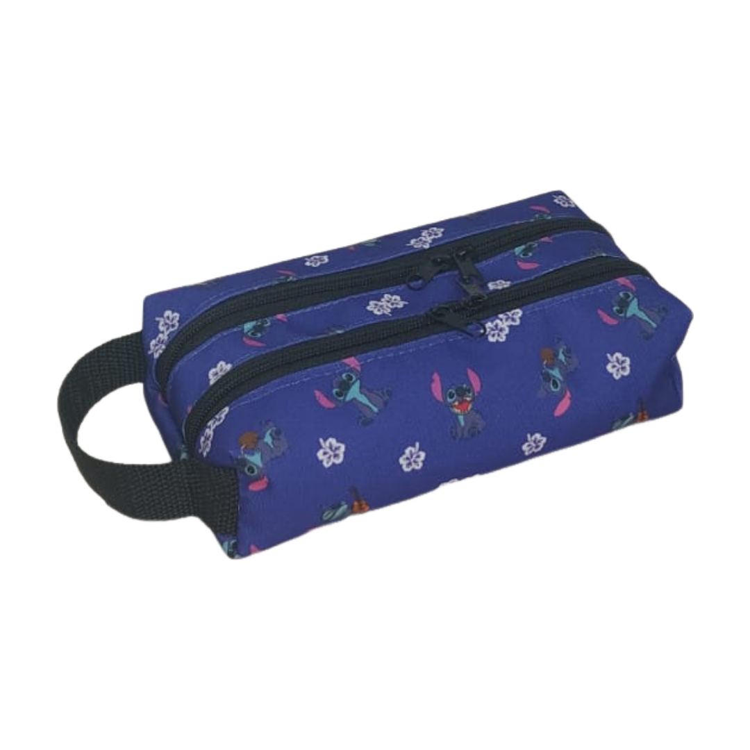 Seu formato retangular com dois compartimentos com zíper permite separar materiais com praticidade. A alça lateral facilita o manuseio e transporte, tornando o estojo ainda mais funcional.