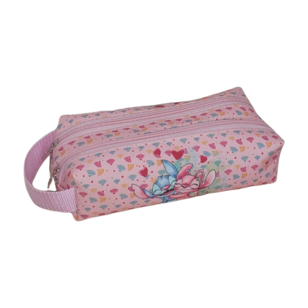 Seu formato retangular com dois compartimentos com zíper permite separar materiais com praticidade. A alça lateral facilita o manuseio e transporte, tornando o estojo ainda mais funcional.